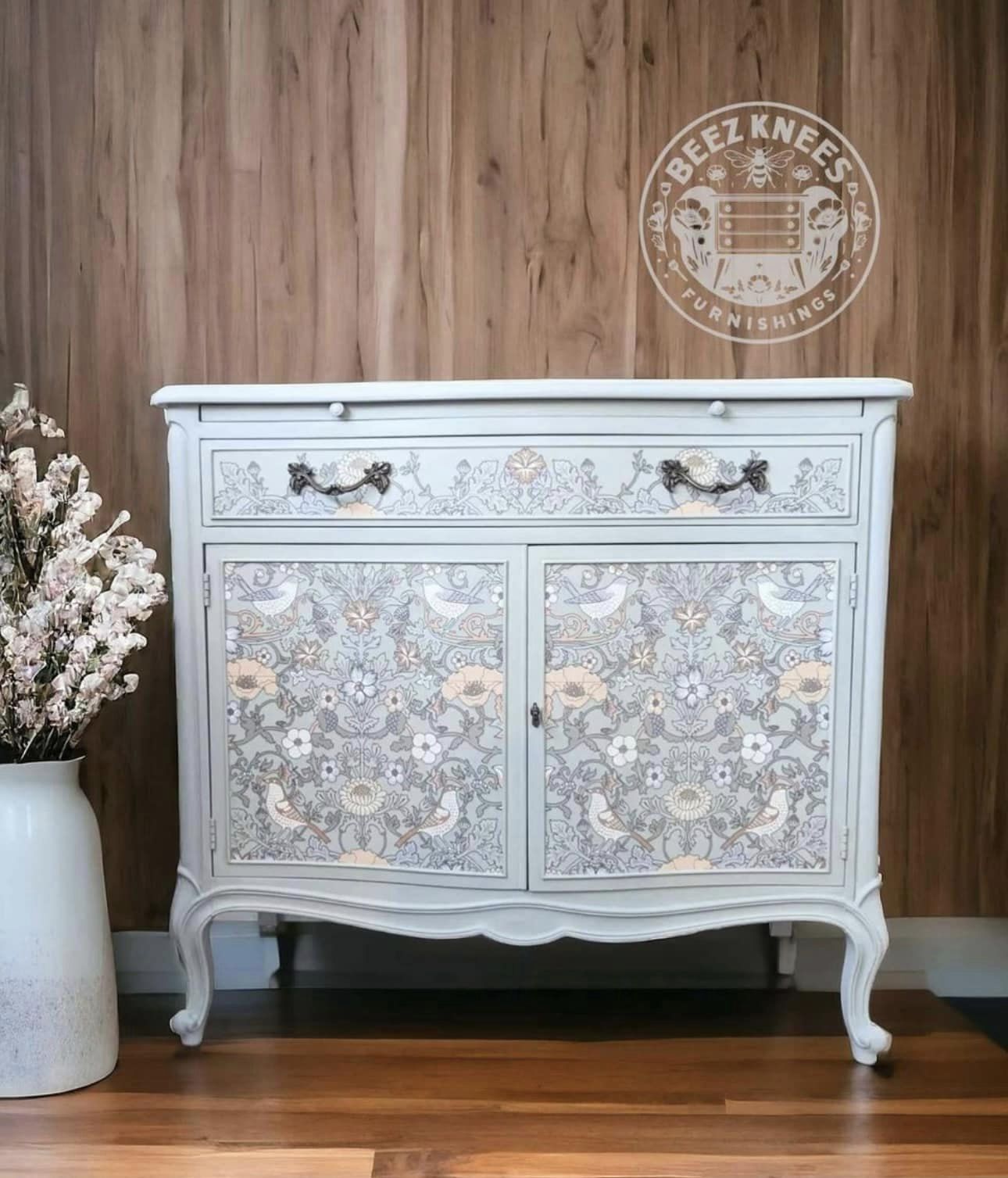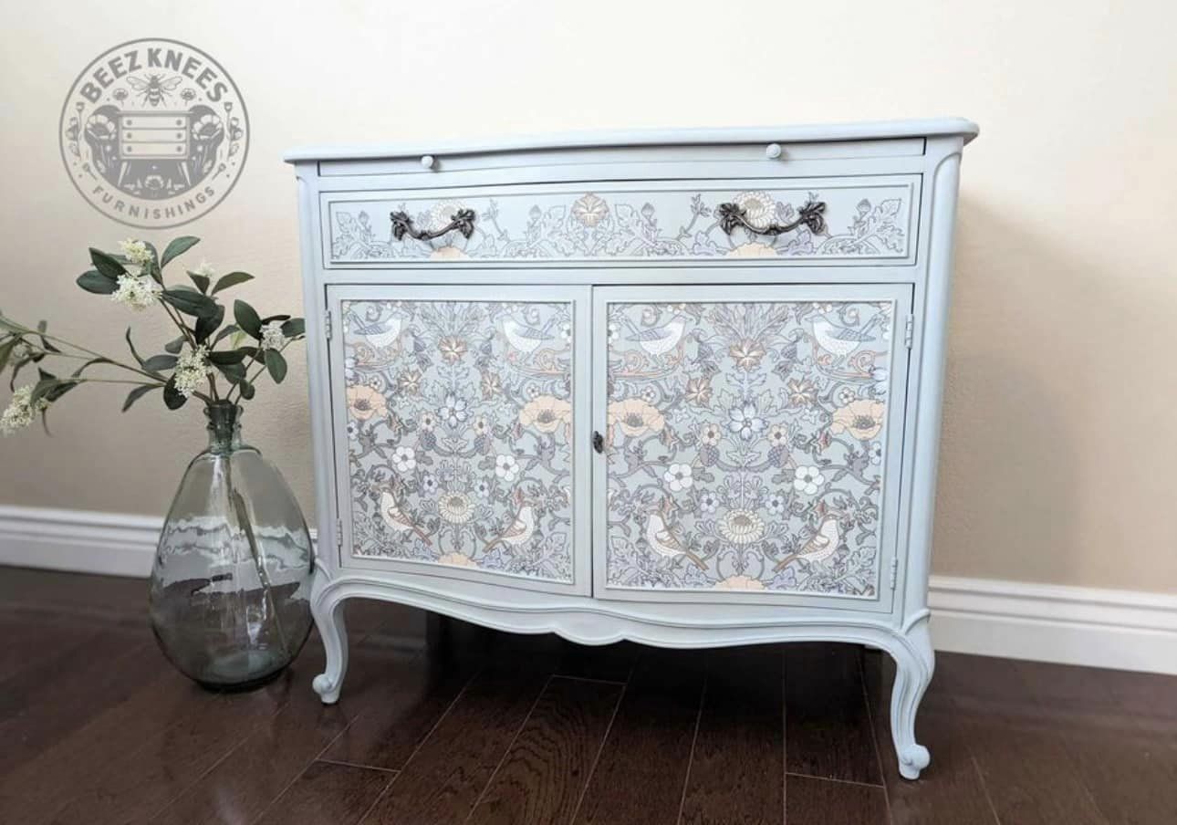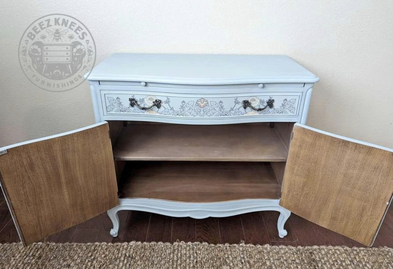 Drexel made French Provincial piece features: Wood construction - no engineered pieces Vintage duck egg color - blue/green tone Acrylic resin furniture paint Embellished on the drawer and door fronts Waxed for extra durability 36" wide, 33" tall, 19" deep Shelf behind the doors Spacious top drawer Pull out tabletop Original hardware - highlighted with bronze gilding to bring out the details The interior of the drawer and inside bottom cabinet is in excellent, like new condition. No stains. NO SHIPPING, local delivery available for a small fee. Otherwise, pick up is available from Shangri-La Lane's shop in Santa Rosa, CA.