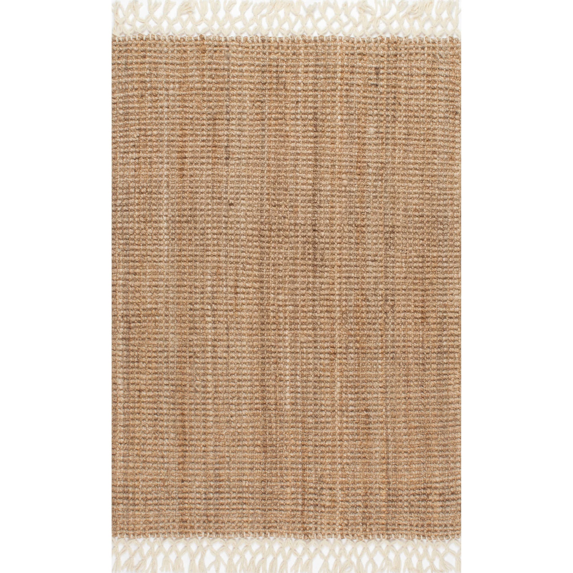 Hand crafted of jute in India this rug is the perfect addition to cottage, farmhouse, or coastal decor. Complete with intricate wool fringe detailing on either end.
