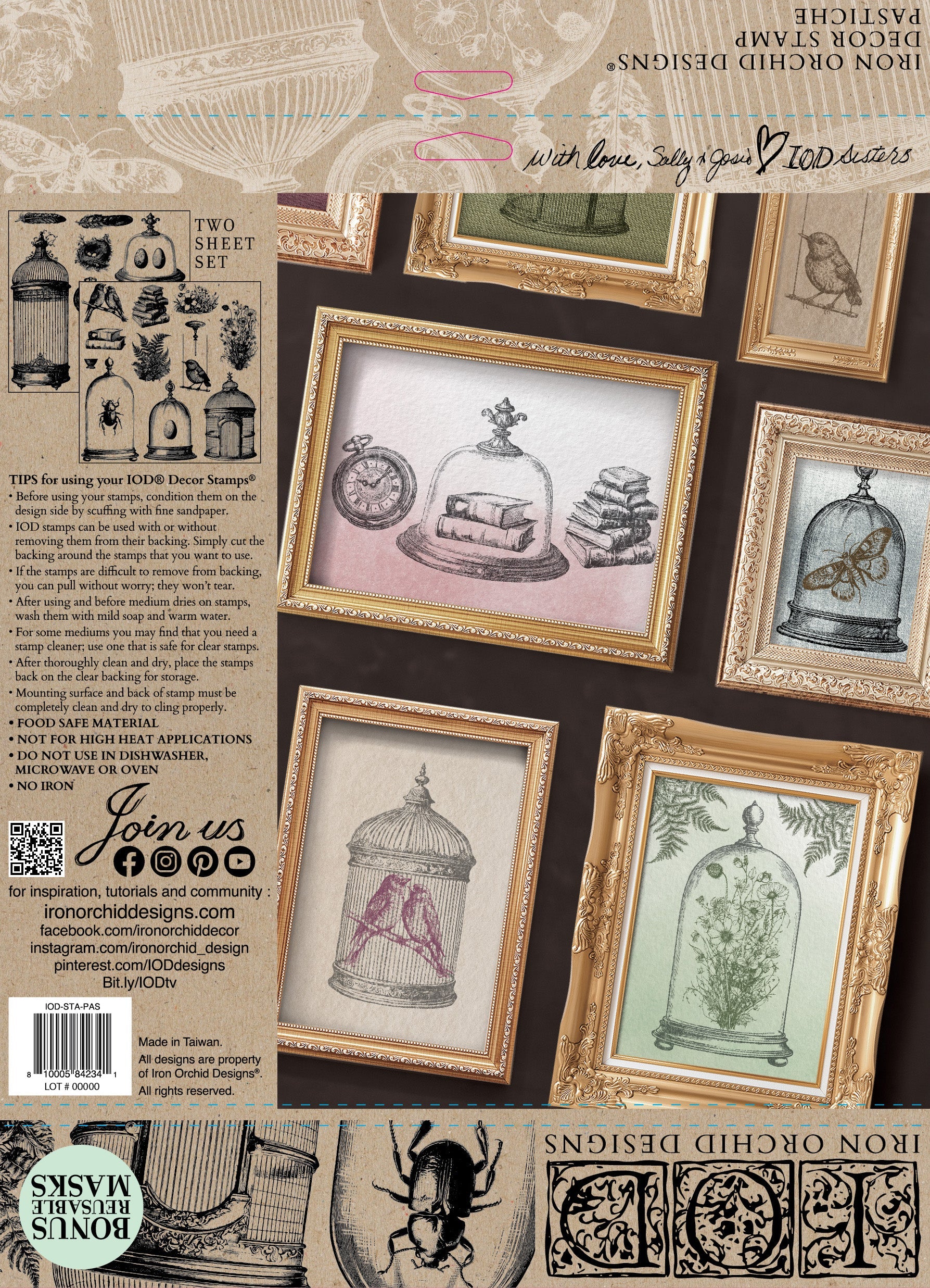 Pastiche, the new two-stamp set from the Iron Orchid Designs Spring 2024 Collection will surely up your layering game! This decor stamp includes two 12x12 inch food safe silicone stamps, featuring large bird cages, nests, birds, eggs, feathers, entomology bugs, florals and domes. These timeless design elements will be sensation used with our masks and layered for multi media artwork, handmade cards, pillows, furniture and smalls keepsakes. junk journaling? oh yes! Use with IOD Inks, paint, pressed into IOD Air Dry Clay.