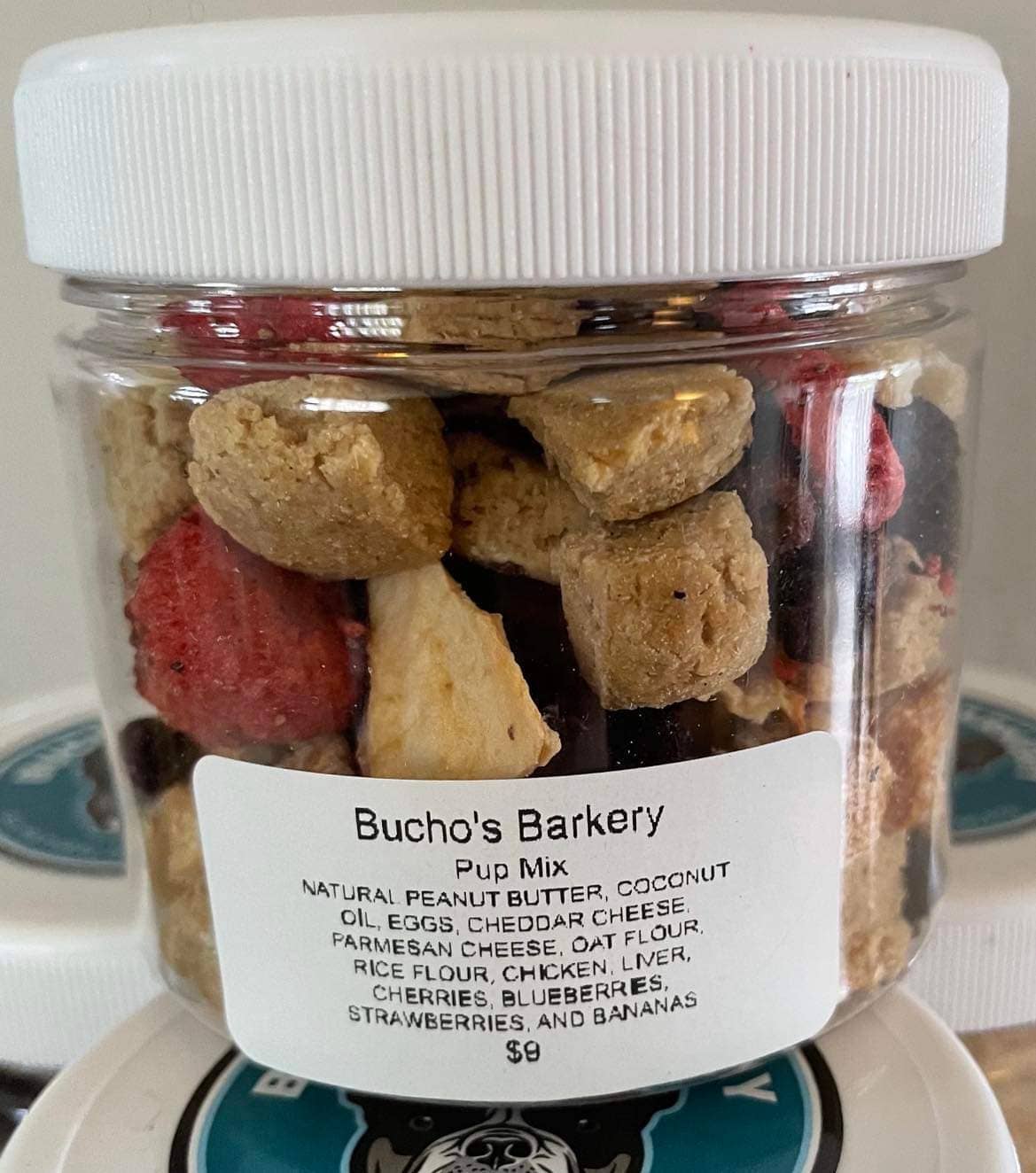 Tasty trail mix for your pup! This has freeze dried chicken, freeze dried liver, freeze dried cheese, freeze dried salmon, mahi, natural peanut butter treats, bacon cheddar treats, pumpkin puree, carob powder, yogurt powder. Contents vary per container, depending on available ingredients.