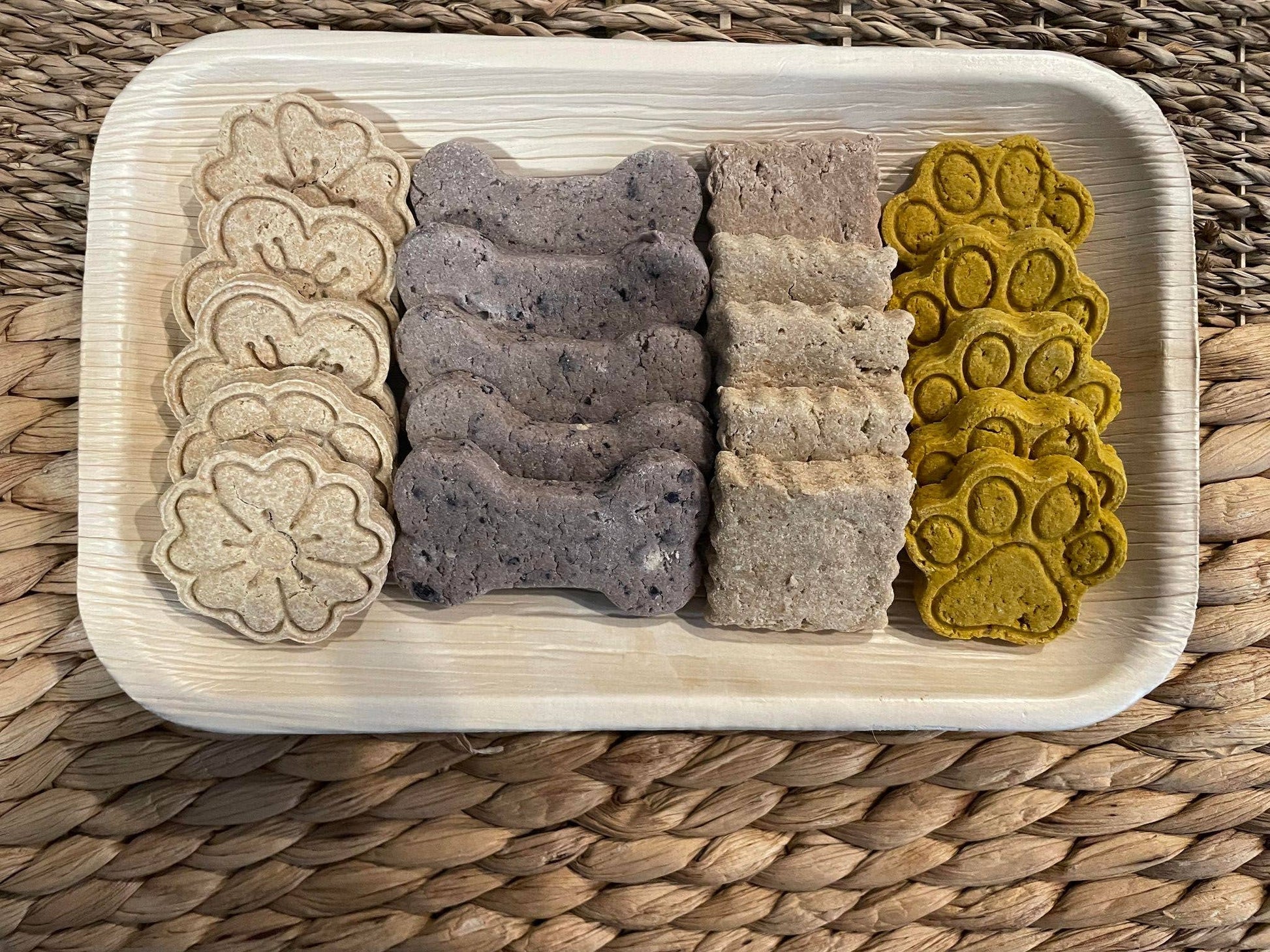 This eco-friendly palm leaf platter is filled with a variety of our signature treats. This platter comes with 5 each of our top-selling flavors; peanut butter, blueberry, strawberry and pumpkin. Designs will vary based on season. The theme for summer is flowers. Each 9.5" x 6" plate is shrink-wrapped to ensure freshness for up to 9 months. Made in United States